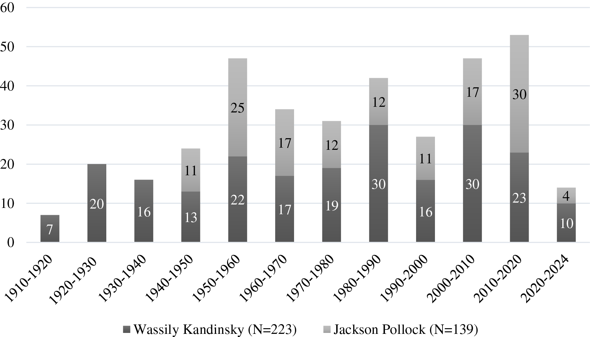 Fig. 1. Solo exhibitions of Wassily Kandinsky and Jackson Pollock by individual decade, quantitative comparison.
