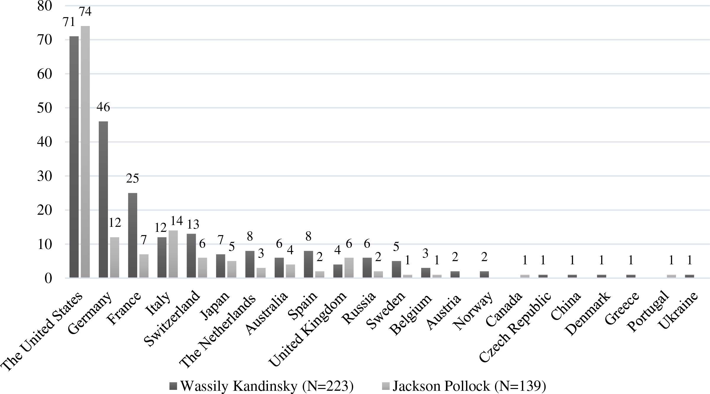 Fig. 2. Solo exhibitions of Wassily Kandinsky and Jackson Pollock by country, comparatively.