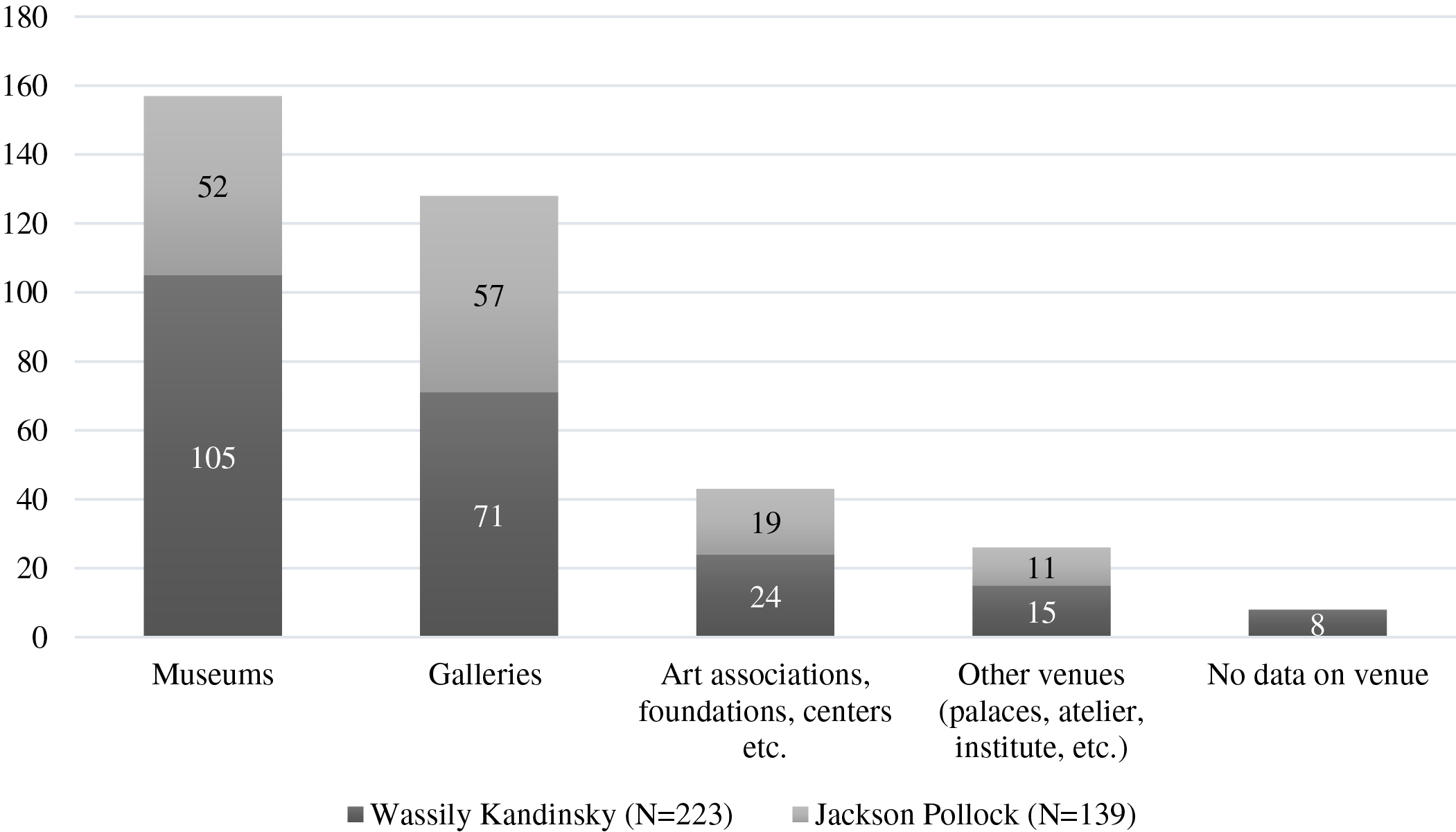Fig. 3. Solo exhibitions of Wassily Kandinsky and Jackson Pollock by type of venue, comparatively.